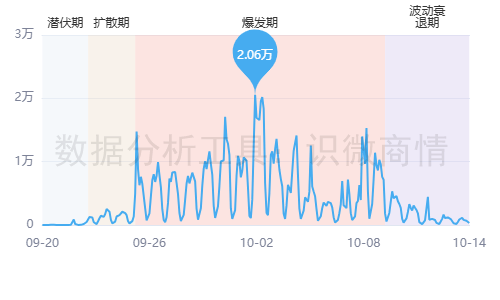 鸡排哥的传播并非偶然,而是有迹可循。根据舆情传播热度的四个阶段(报告数据统计时间:2025年9月20日00:00–2025年10月15日00:00),“潜伏期-扩散期-爆发期-波动衰退期”,可以看到鸡排哥如何从“默默无闻”到“全网爆火”的过程。(识微商情系统免费试用➡️)