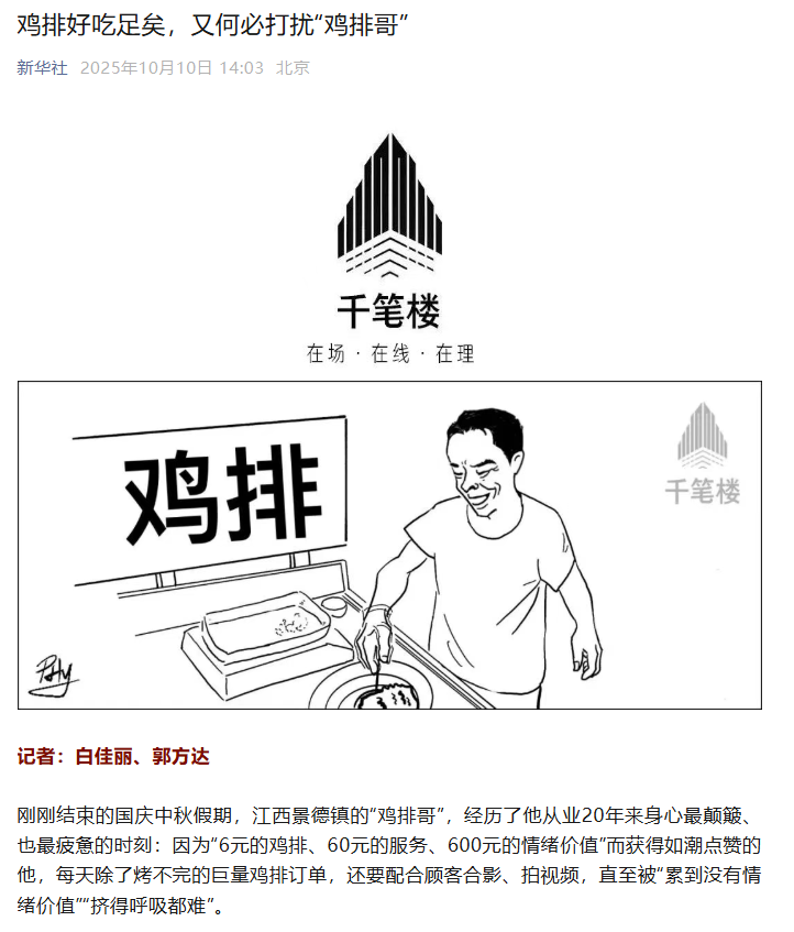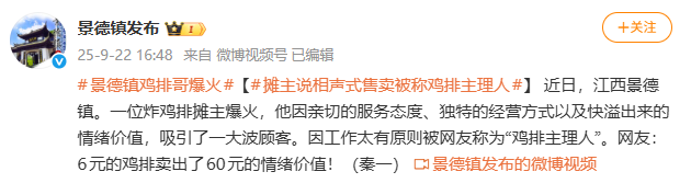 • 媒体动作:“景德镇发布”于9月22日率先发文,将鸡排哥定义为“鸡排主理人”,强调其“6 元鸡排卖出60元情绪价值”;泰和发布、德城发布等地方账号跟进,挖掘“夫妻协作”“暴雨天出摊”等温情细节,赋予其“真诚劳动者”标签;