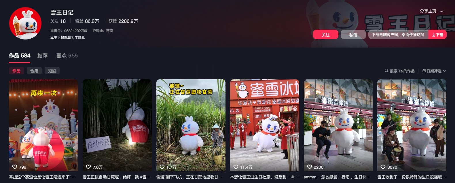 语言能指:“你爱我,我爱你,蜜雪冰城甜蜜蜜”的洗脑神曲,旋律简单、歌词直白,传唱度覆盖老幼群体,解决了“下沉市场传播难”的问题;(蜜雪冰城官方视频)