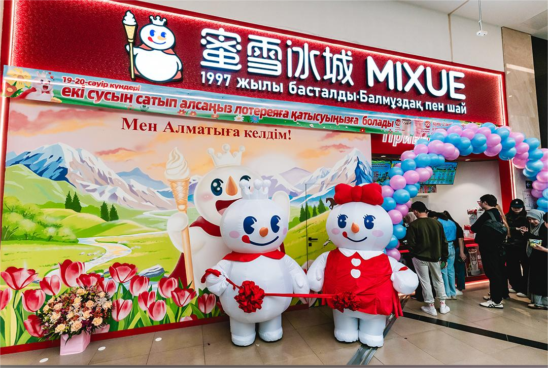 行为能指:门店统一悬挂雪王标识、员工佩戴雪王徽章、周边产品(如吸管、杯套)植入雪王形象,形成“视觉-听觉-行为”的全方位识别闭环。(下图为蜜雪冰城官网展示哈萨克斯坦首店)