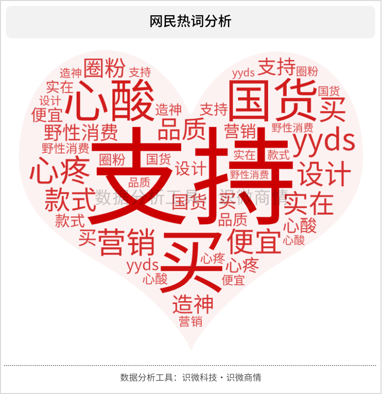 “支持鸿星尔克”、“支持国货”、 表示要购买的声音是最多,其次是为亏损、做慈善却无人问津的鸿星尔克感到心酸、心疼的声音。让品牌库存都告急的“野性消费”成为出圈梗。网友对鸿星尔克的评价便宜、实在。