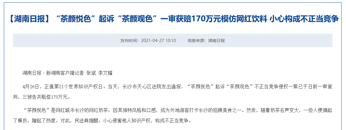 舆情与法律结果:原创胜诉但符号损伤持续较久。历经四年多诉讼,2023年法院终审判决“茶颜观色”相关主体构成商标侵权及不正当竞争,需立即停止使用侵权标识,赔偿茶颜悦色经济损失及合理维权费用共计170万元。此次纠纷也推动茶饮行业强化符号知识产权保护意识,成为新消费品牌符号维权的标杆案例。