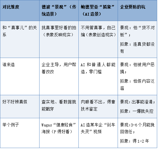 景观和拟象的区别,直接决定企业要防什么坑,一张表说清(表1)。