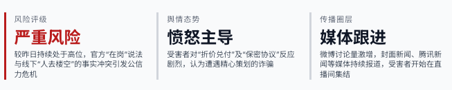 洞察 | 矛盾已从“钱款纠纷”上升为“事实真相”之争,公信力修复难度极大。 |