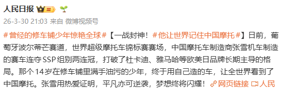 央视、人民日报、新华社等权威媒体下场站台,第一时间报道夺冠喜讯,把“WSBK赛事夺冠”这个原本只有机车圈关注的垂直领域内事件,直接拉到了全国亿万观众面前,相当于官方盖章“这事儿值得看”,直接定下了全网的讨论基调,让原本小众的赛事,瞬间变成全民热议的焦点。