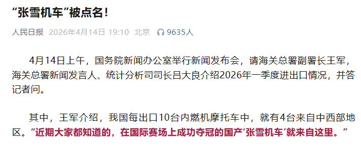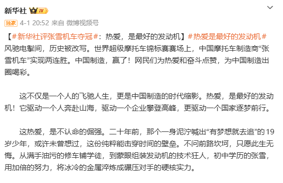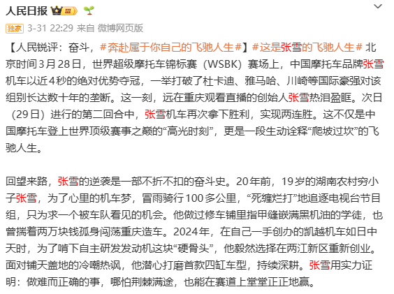 权威媒体不仅让事件进入公众视野,还精准给张雪机车贴上了三大流量标签,每一个都精准戳中大众的情绪点,让人一眼就能记住、愿意传播: