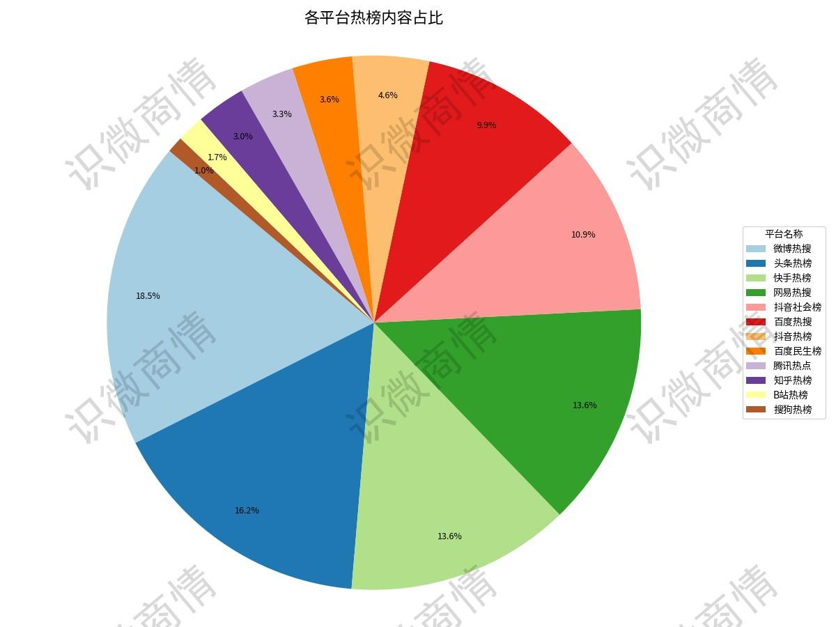 微 博热搜最多,占比18.5%,平均热度302,500,内容碎片化程度高,话题切换频繁,用户互动性强,但深度传播不足。