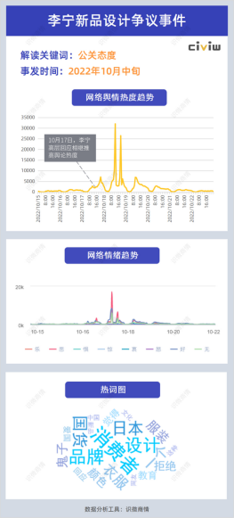 这次的案例解读,可借助事件网络情绪的变化趋势。我们能发现“恶”这一负面情绪,其实并非最初就占据了高位,而是在李宁高层回应后才如“破竹”般冒头。说明在质疑初起之时,因未及官方表态,舆论场上的观点尚较为保留,仍有博弈空间;而高层的表态,却使之走向反面。