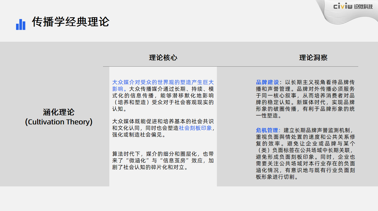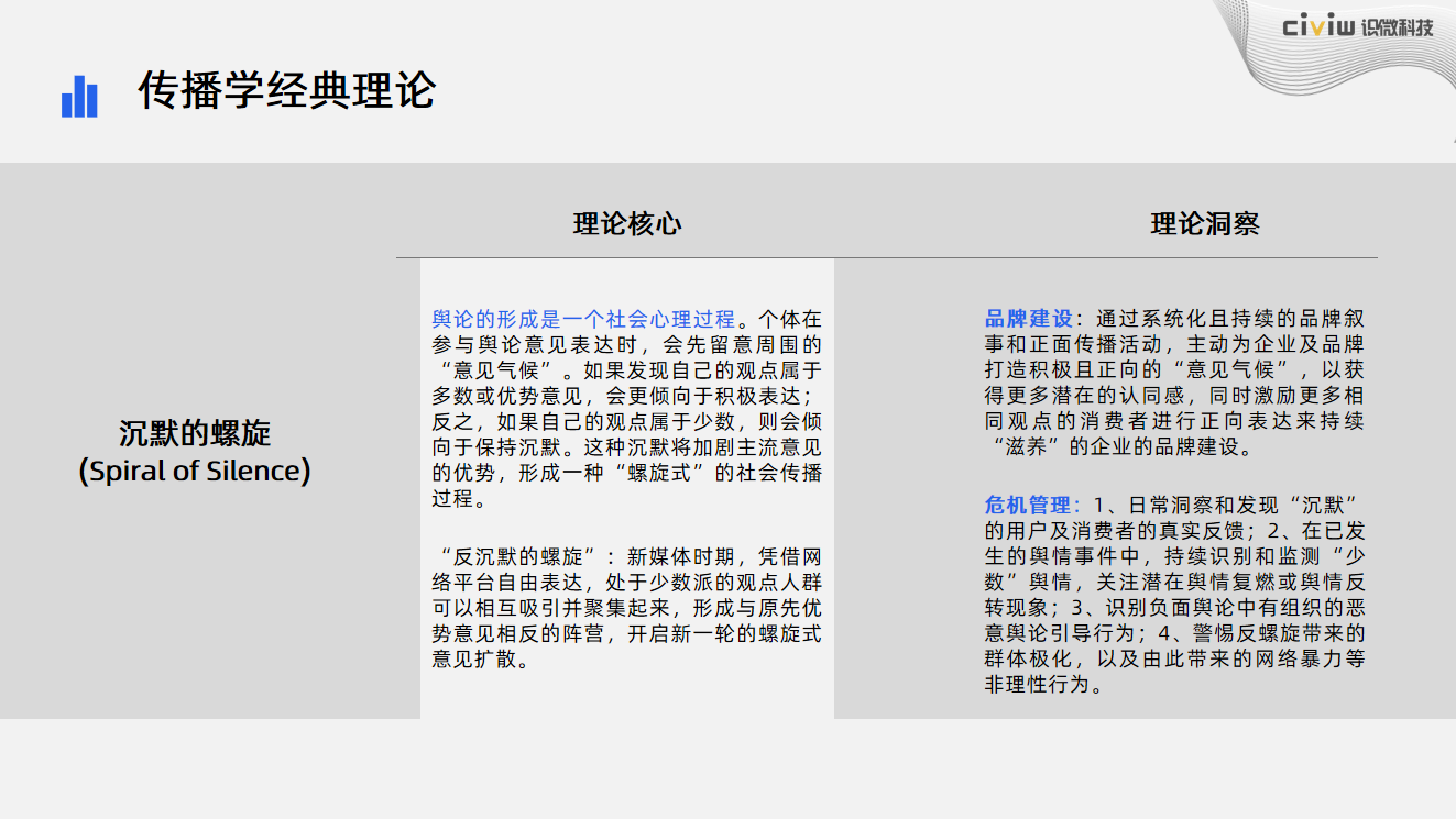 品牌建设:通过系统化且持续的品牌叙事和正面传播活动,主动为企业及品牌打造积极且正向的“意见气候”,以获得更多潜在的认同感,同时激励更多相同观点的消费者进行正向表达来持续“滋养”的企业的品牌建设。