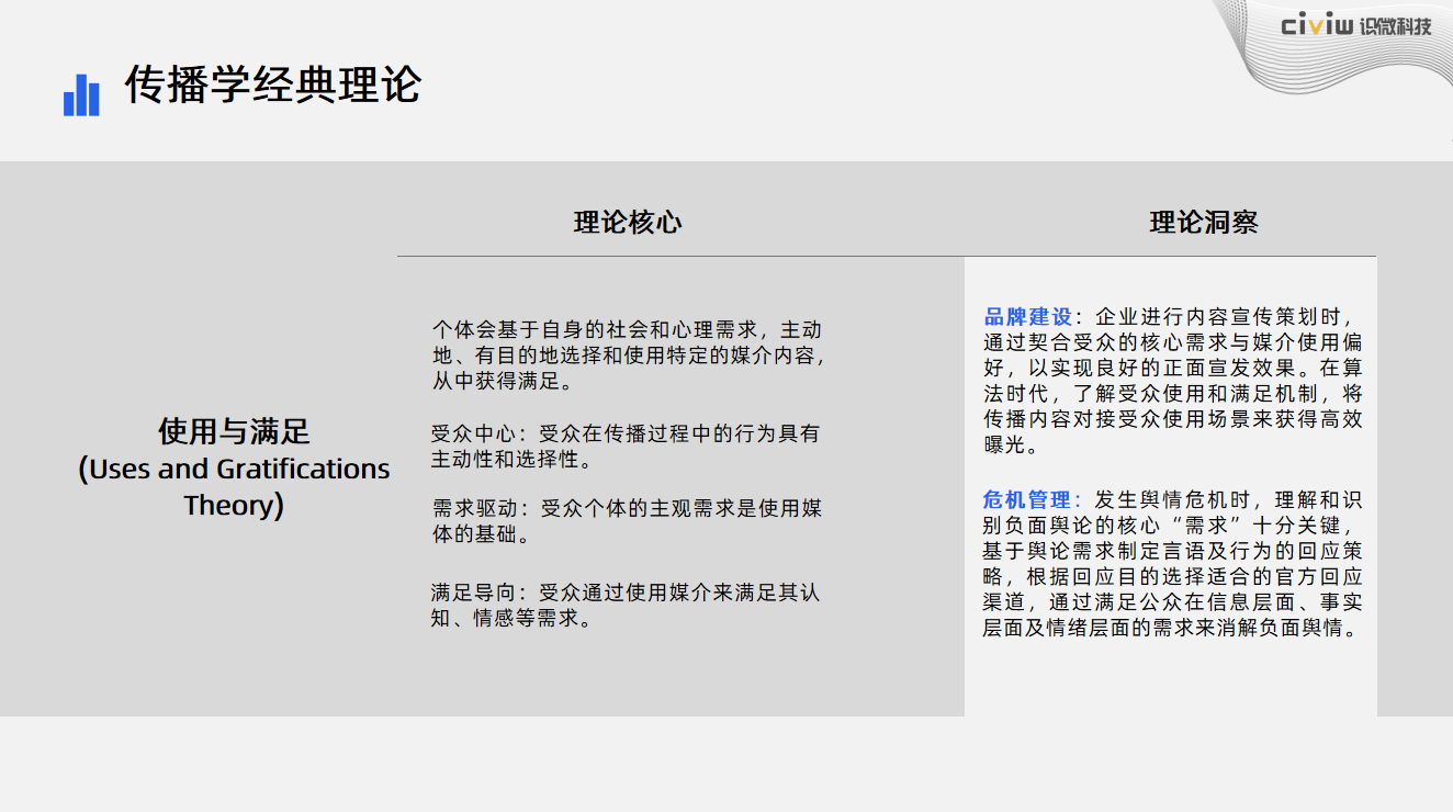品牌建设:企业进行内容宣传策划时,通过契合受众的核心需求与媒介使用偏好,以实现良好的正面宣发效果。在算法时代,了解受众使用和满足机制,将传播内容对接受众使用场景来获得高效曝光。
