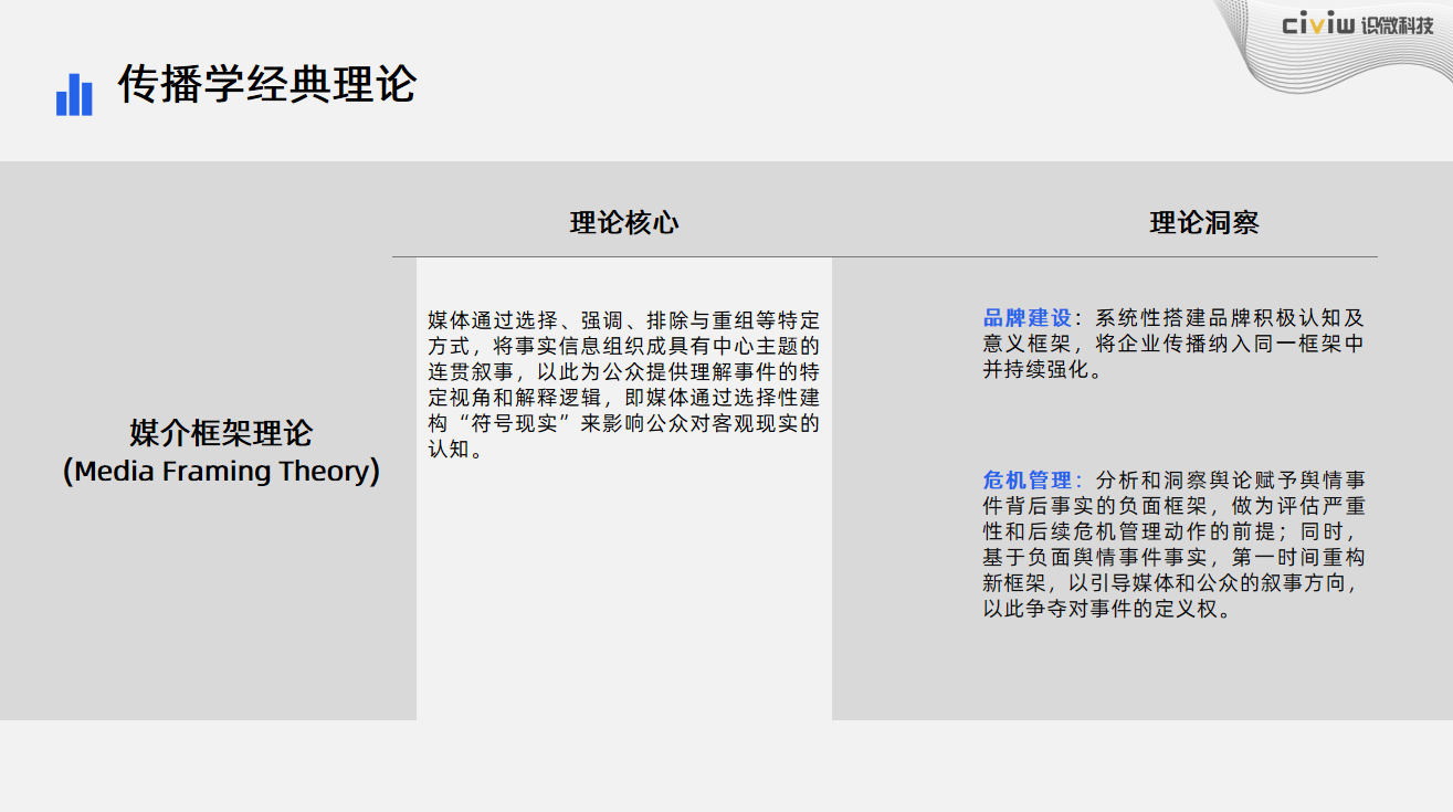 2、分析洞察:用议程设置、框架理论等工具,快速研判危机性质、责任归属与发展趋势。