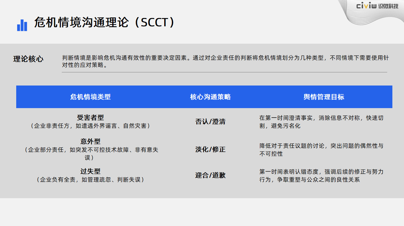精准分类、对症下药!根据企业责任程度,将危机划分为受害者型、意外型、过失型,对应采取“澄清切割、淡化修正、诚恳道歉”的针对性策略,最大化降低损失。