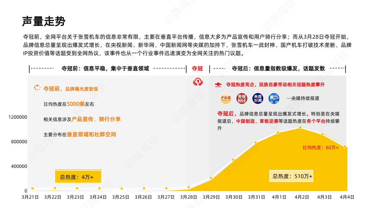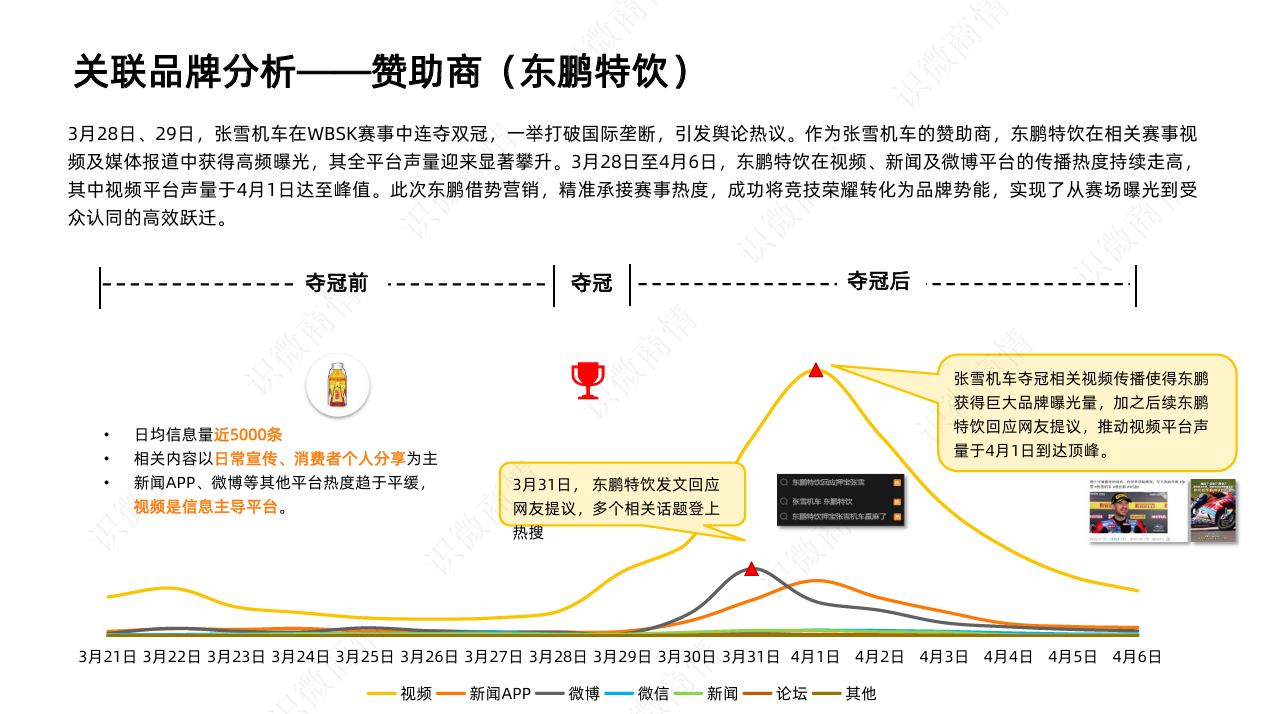 高频曝光: 在相关赛事视频及媒体报道中获得高频展示,全平台声量在 4 月 1 日达到峰值。