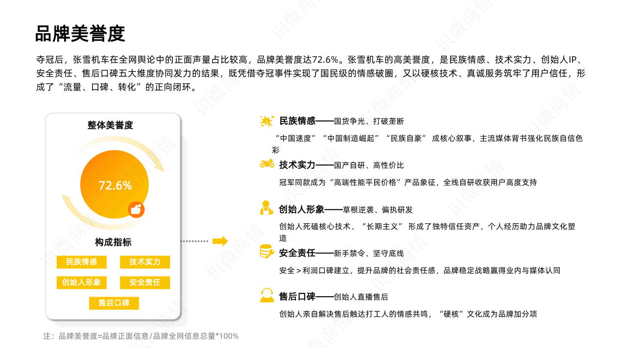 根据识微 AI 定性分析,张雪机车品牌美誉度高达 72.6%。其口碑由以下五个核心维度支撑: