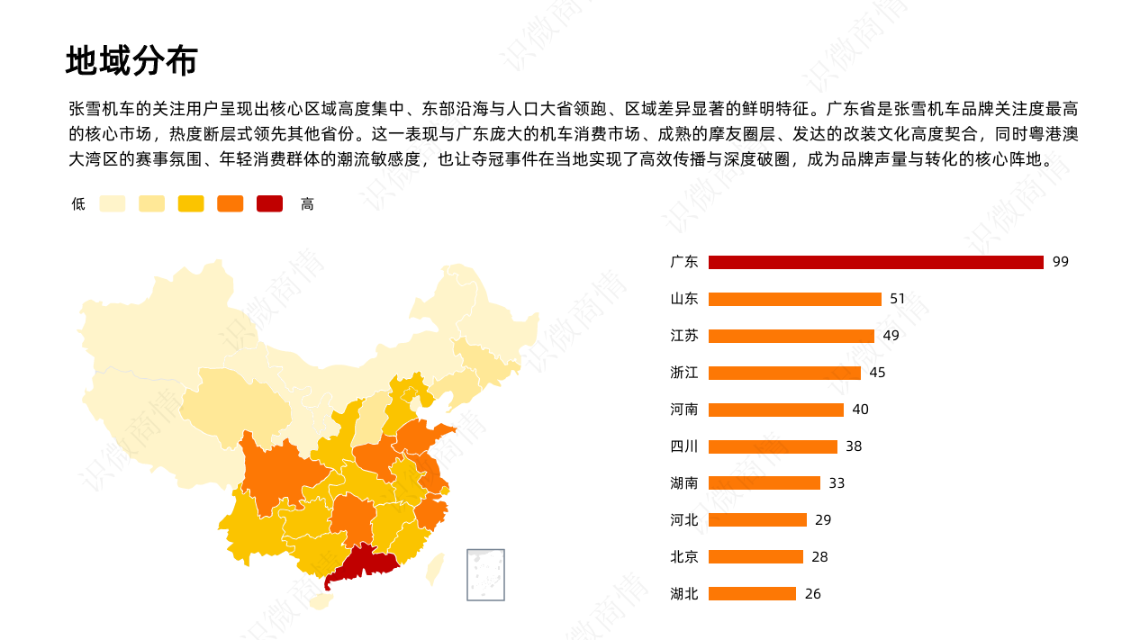 张雪机车的关注用户呈现出核心区域高度集中、东部沿海与人口大省领跑、区域差异显著的鲜明特征。