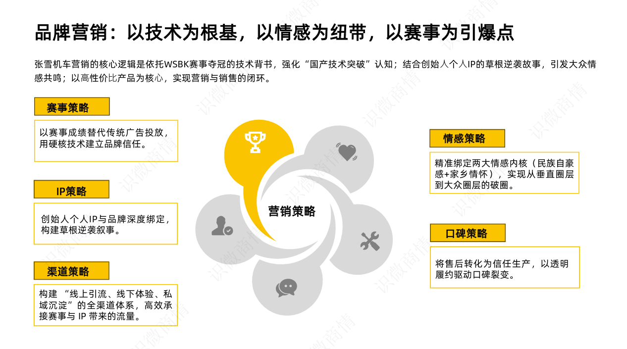 张雪机车营销的核心逻辑是依托 WSBK 赛事夺冠的技术背书,强化“国产技术突破”认知,并结合创始人草根逆袭的故事引发大众情感共鸣,最终实现从流量到销售的闭环。