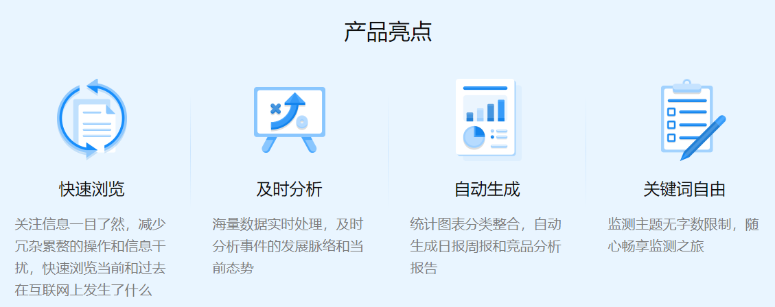 为企业提供品牌、行业、营销、口碑、竞争对手等方面的舆情监测和商情分析报告。