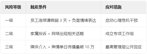 企业应针对“职场冲突→极端事件”的演化路径,设置三级预警指标: