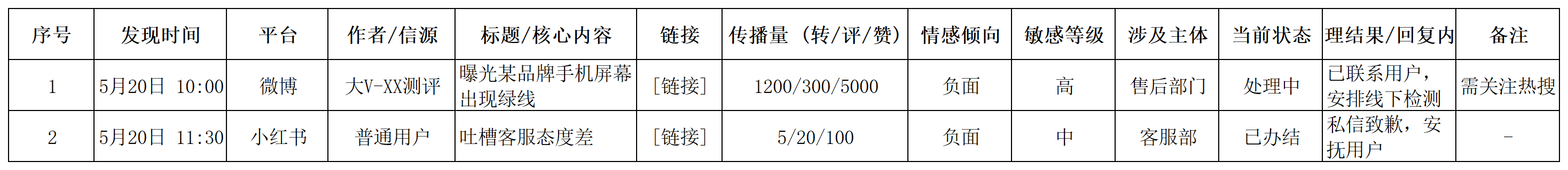对于负面舆情,黄金4小时原则依然适用。在做表时,建议按“发现时间”倒序排列,最新的在最上面,方便优先处理。